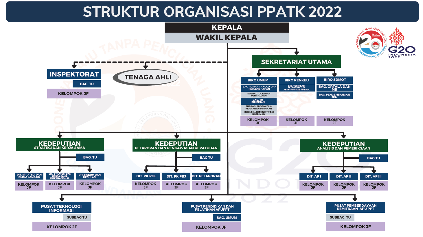 Sesuai dengan Peraturan Kepala PPATK Nomor 5 Tahun 2022 tentang Organisasi dan Tata Kerja Pusat Pelaporan dan Analisis Transaksi Keuangan, susunan organisasi PPATK terdiri atas :